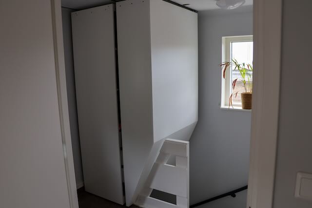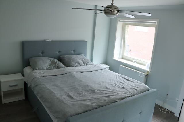 De grootste slaapkamer van het huis bevat een tweepersoonsbed en een dubbele IKEA PAX-kast. In de kast vind je verschillende planken, lades en een gedeelte om kleding op te hangen aan kledinghangers.