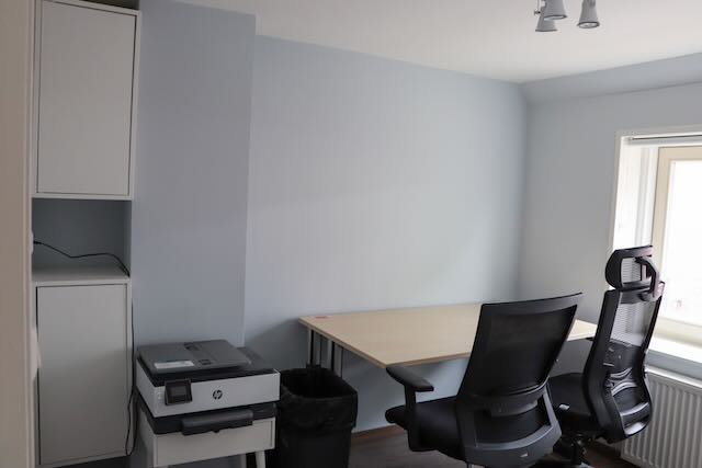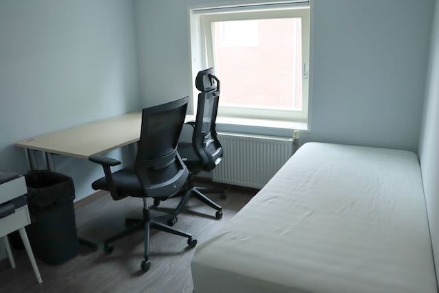 Gelegen naast de grootste kamer, heeft het huis ook een kleinere slaapkamer. Deze slaapkamer bevat een bureau, bureaustoelen, éénpersoonsbed en een smalle kast in de muur. Je kunt deze kamer hierdoor ook goed inzetten als thuiswerkplek.