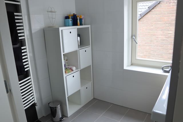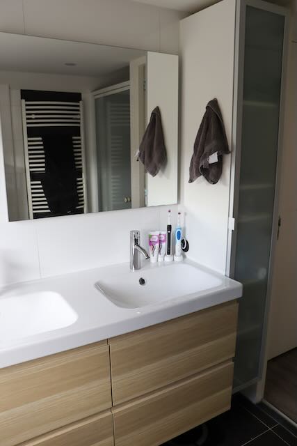 De badkamer bevat een dubbele wastafel met lades, een hoge, smalle hangkast en een staande vakkenkast. In de hoek van de badkamer vind je de douchecabine met een regendouche douchekop en een hand douchekop.