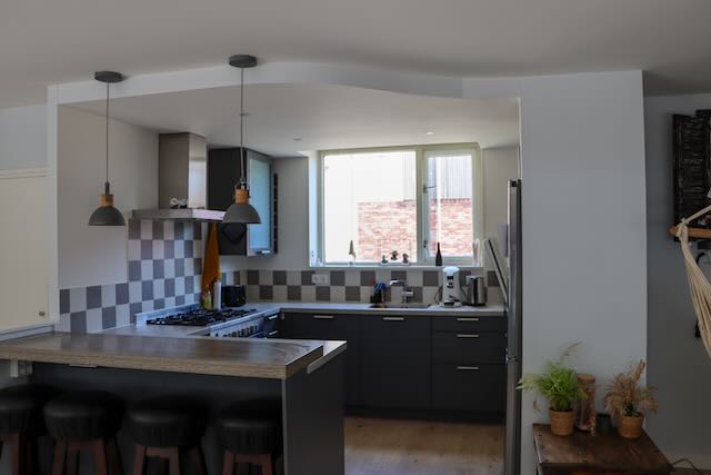 6 pits gasfornuis, vaatwasser, koelkast & vriezer, koffiezetapparaat, waterkoker, broodrooster, oven en magnetron.