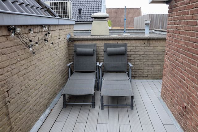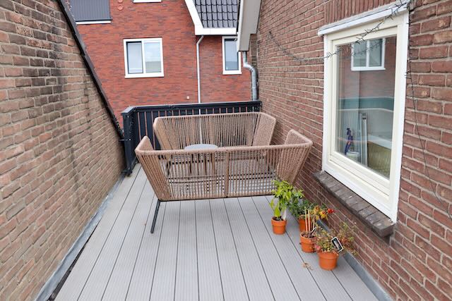 Het balkon is 30m2 groot en zit aan weerszijden van het huis. Deze is te bereiken met een kort paadje waar je via een deur op de eerste verdieping op komt. Het balkon heeft een barretje met hoge stoelen aan de linkerkant van het huis, in combinatie met ligstoelen. De rechterkant bevat twee banken. Aan weerszijden vind je meerdere stopcontacten en een lichtsnoer.
